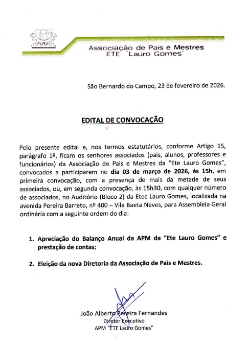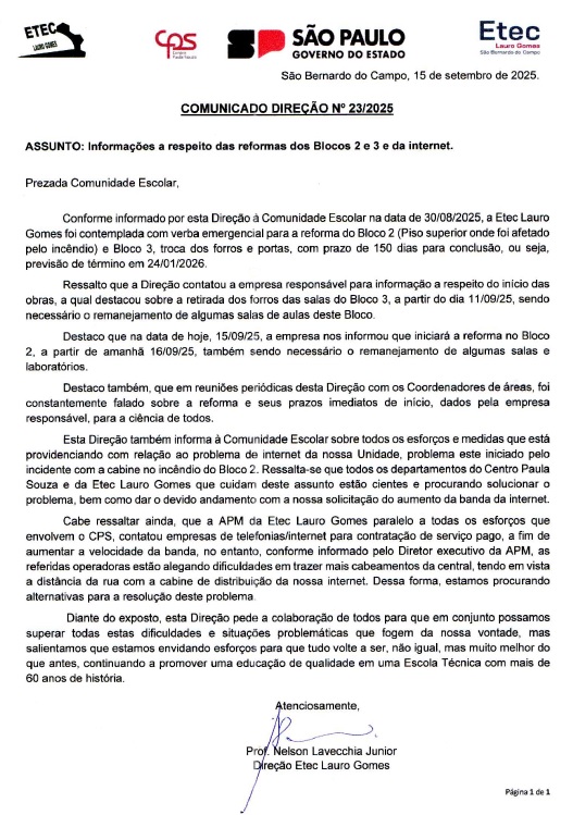 Acesse o comunicado da Direção, referente ao acesso de veículos ao Campus Etec Lauro Gomes/Fatec Adib Moisés Dib.