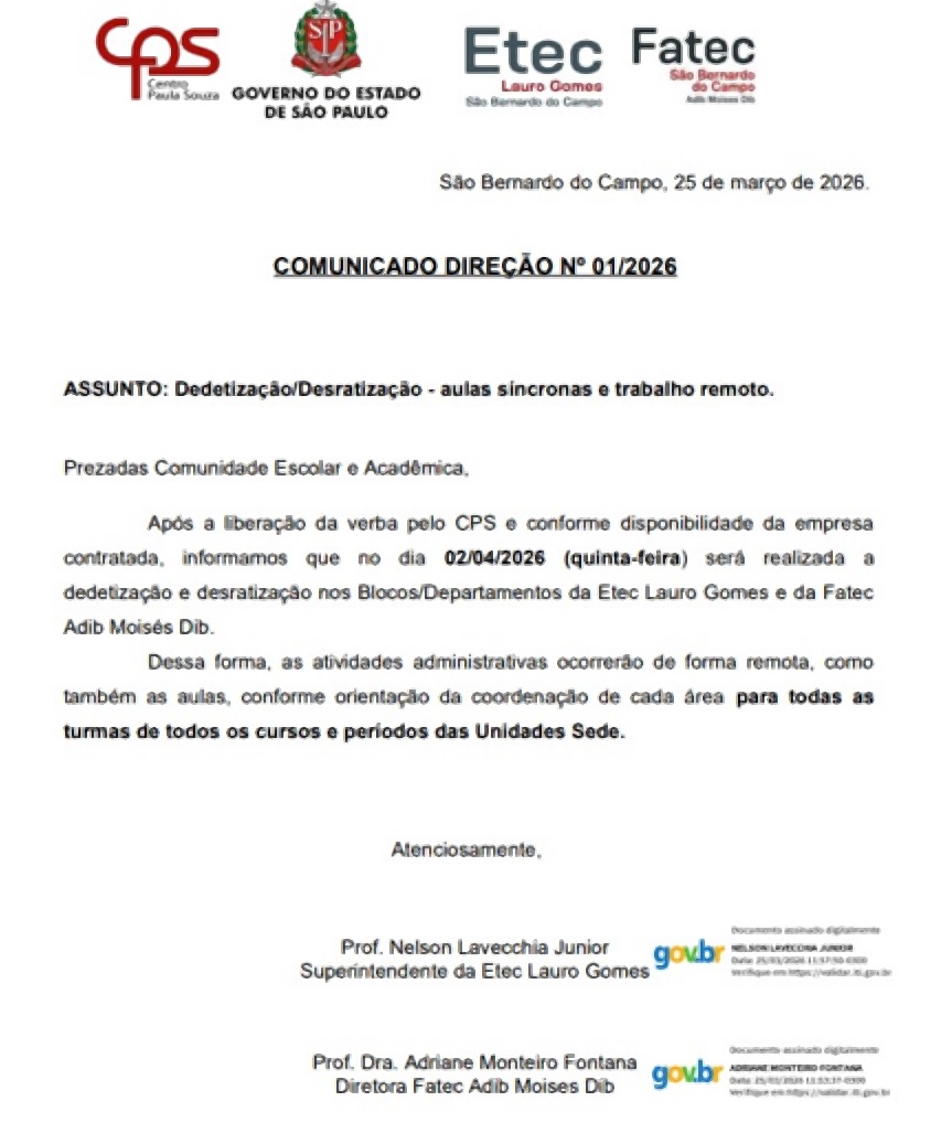 Acesse o comunicado da Direção, referente ao acesso de veículos ao Campus Etec Lauro Gomes/Fatec Adib Moisés Dib.