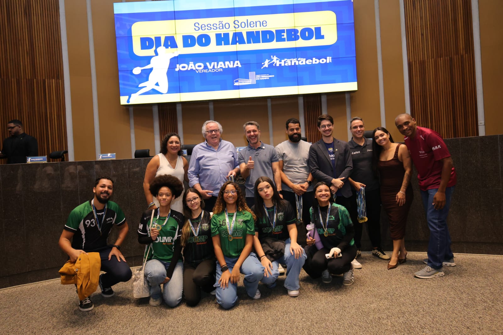 "A convite do vereador João Viana, nossa equipe de handebol feminino, vice-campeã dos Jogos Escolares e campeã de Copa Etec em 2025, se fez representada no último sábado dia 28/02, na Sessão Solene da Câmara Municipal de São Bernardo, acompanhados pelo prof. Rian Gonçalo".