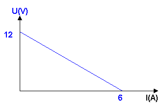 U = 12 - 2.I a tabela a seguir mostra alguns valores de U e I, inclusive os valores limites( máxima tensão e máxima corrente ), e a figura4 mostra a curva característica completa. O valor de I que anula a tensão é chamado de corrente de curto circuito ( ICC ) e no exemplo vale 6A. , e o valor da tensão em vazio ( aberto) é chamada de Força Eletromotriz (E). ( Inicio )